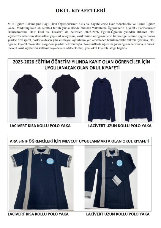 OKUL KIYAFETİMİZ 1. SINIFLAR VE ARA SINIFLAR GÖRSELLERDEKİ GİBİ LACİVERT POLO YAKA TİŞÖRT, SWEET OLACAKTIR.